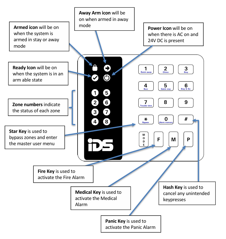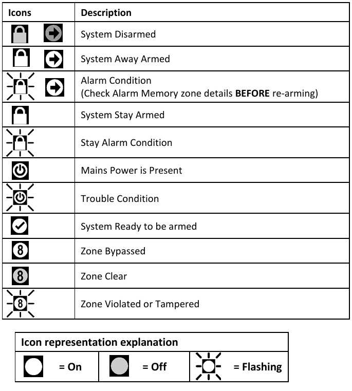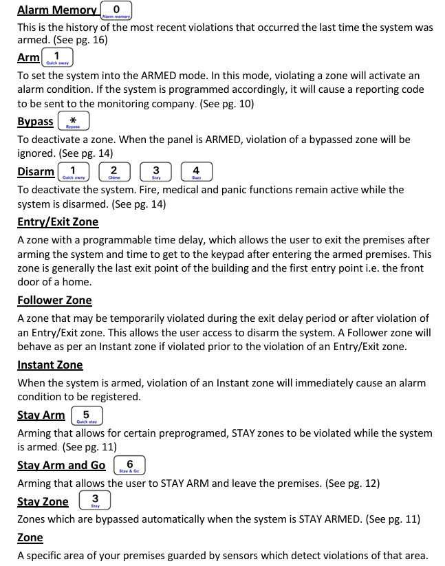 - If a strobe (or flashing light) has been installed and an alarm condition is registered, the light will continue flashing until a valid [USER CODE] is entered.