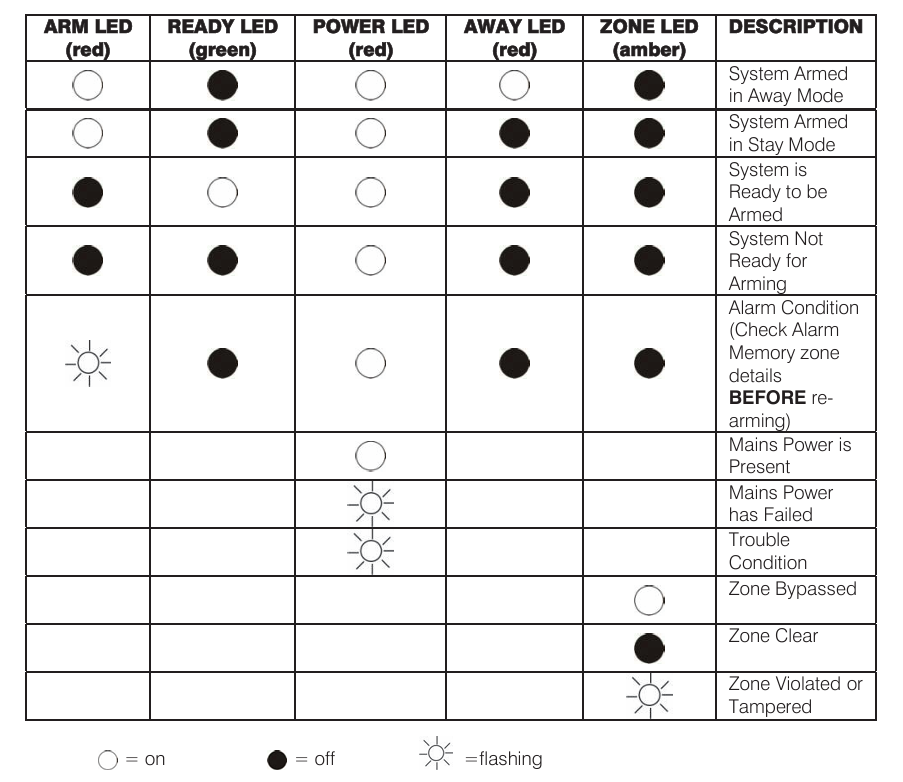 - The READY LED turns off, and the ARM LED will come on and the keypad buzzer will beep repeatedly for the duration of the exit delay. Any bypassed zones will be indicated by a steady on zone LED.